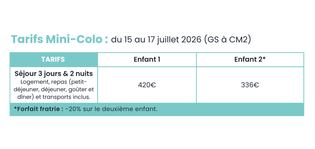 FORFAIT FRATRIE -20% : si vous souhaitez inscrire votre deuxième enfant, ajoutez à nouveau ce produit dans votre panier et appliquer le code promo COLO-FRATRIE pour bénéficier de la remise.