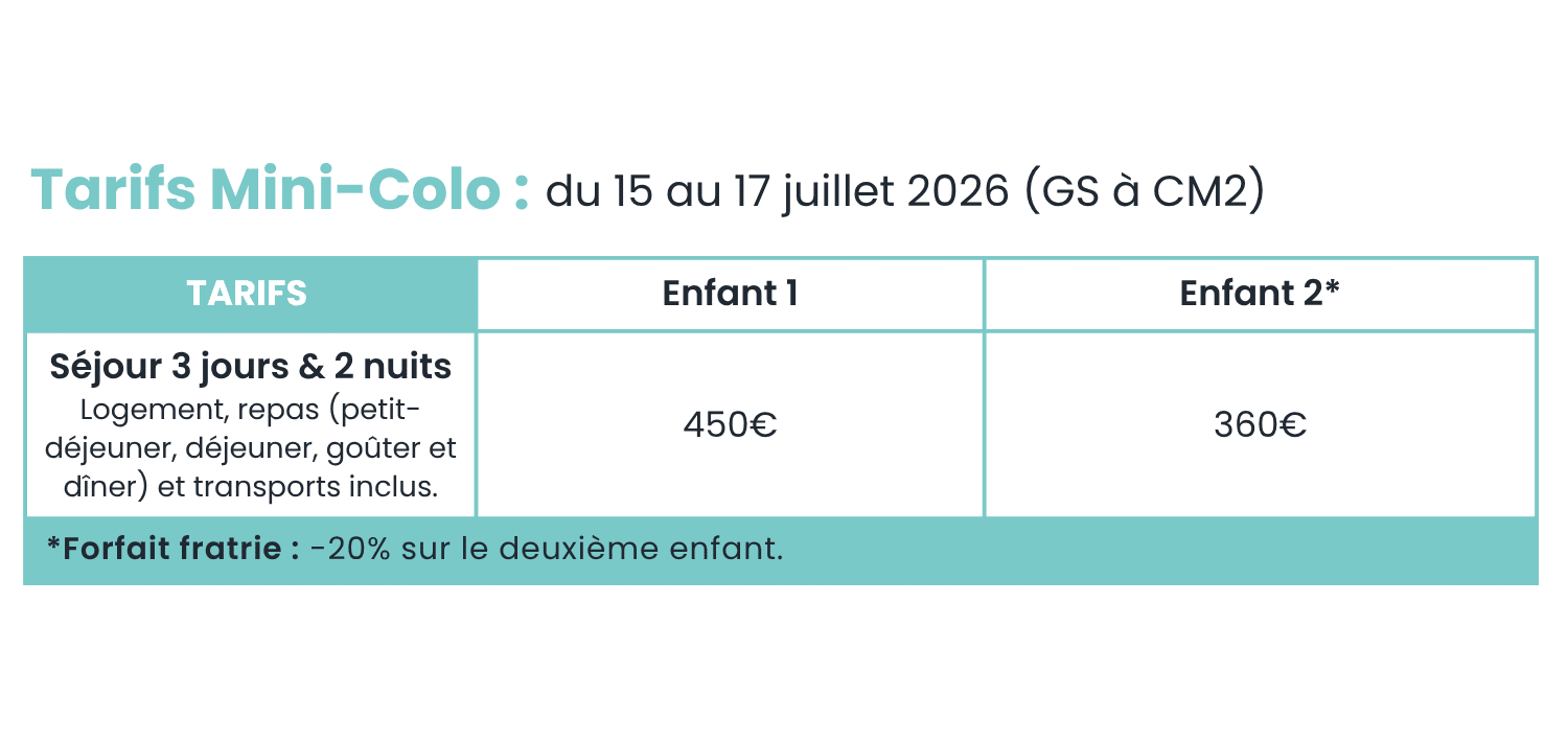La Colo des Aventuriers a été pensée pour être simple et confortable pour les familles. Le séjour comprend : l’hébergement, les activités, l’ensemble des repas (petit-déjeuner, déjeuner, goûter et dîner), ainsi que les transports.