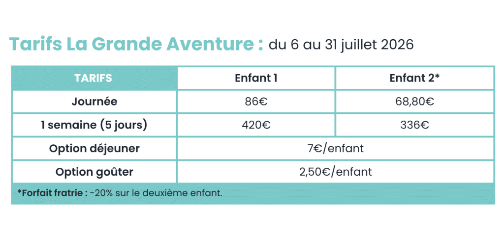 Les tarifs de La Colo des Aventuriers du 15 au 17 juillet pour les enfants de la GS au CM2 se trouvent sur la page dédiée.