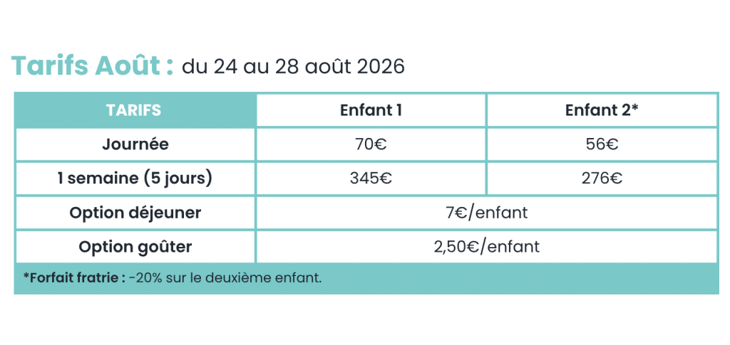 Les tarifs ci-dessous correspondent à l’accueil des enfants sur toute la période d’ouverture estivale chez Les Petites Familles, sorties et déplacement en bus compris.